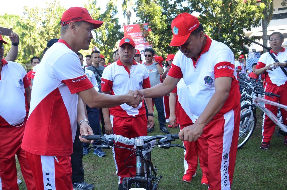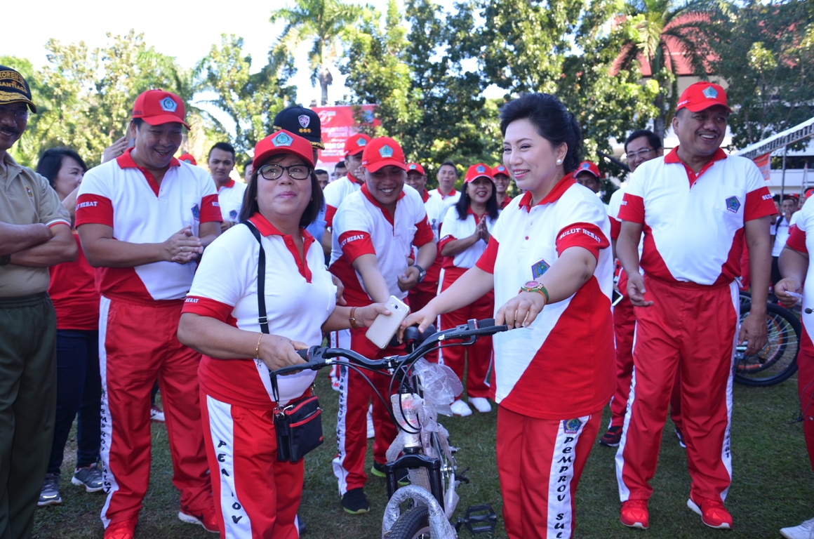 Kesempatan itu Karo Pemerintahan dan Humas DR Jemmy Kumendong MSi, selaku Sekretaris Umum Panitia menyampaikan, dalam kegiatan ini telah diserahkan hadiah door prise yang merupakan bantuan dari BUMN-BUMD dan Perbankan, antara lain dari Bank Indonesia Sulut 4 unit sepeda, BRI 3 unit sepeda dan 20 tabungan senilai Rp.500 ribu, Bank Sulutgo 50 item bingkisan, Telkom Sulut 100 Voucer pulsa dan power bank 12 unit serta dari Pertamina 4 unit sepeda.