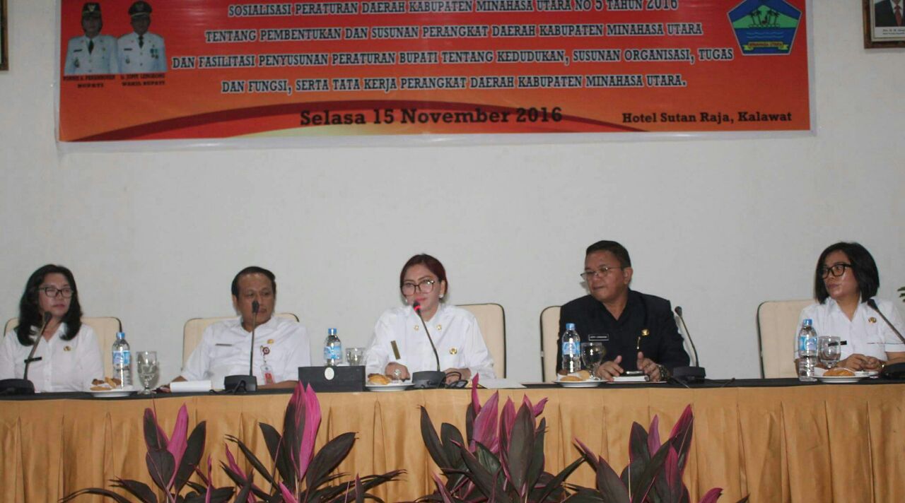 minutmanadoterkini.com, AIRMADIDI-Bupati Minahasa Utara (Minut) Vonnie Aneke Panambunan (VAP) mengatakan penyusunan Organisasi Perangkat Daerah (OPD), meski miskin stuktur harus kaya fungsi. Hal ini disampaikannya, saat membuka sosialisasi peraturan daerah (Perda) Nomor 5 tahun 2016 tentang pembentukan dan susunan perangkat daerah dan fasilitasi penyusunan Perbup tentang kedudukan susunan organisasi tugas dan fungsi serta tata kerja perangkat daerah, Rabu (16/11/2016) di Sutanraja Hotel Minut.