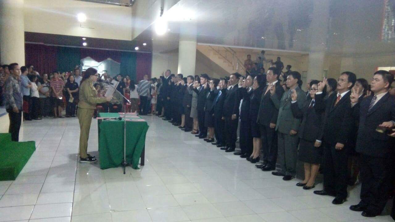rollingmanadoterkini.com, AIRMADIDI-Rolling pejabat dilingkup Pemkab Mitra kembali digelar, Jumat (6/1/2017), di Atrium Kantor Bupati dan langsung dipimpin Bupati Minahasa Utara (Minut) Vonnie Anneke Panambunan (VAP), melantik 77 pejabat, yang terdiri dari esalon II B sebanyak 21 orang, esalon III A 11 orang, esalon III B 4 orang, esalon IV A 30 orang dan eselon 4 B 11 orang.