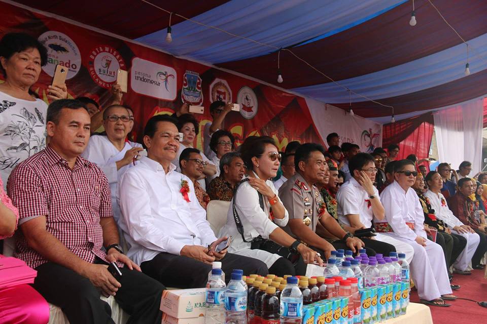Nampak hadir di panggung kehormatan Kapolda Sulut, Ketua DPRD Andrei Angouw serta tokoh warga keturunan Tionghoa, Hengky Wijaya