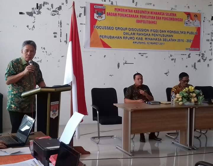 manadoterkini.com, AMURANG – Pemerintah Kabupaten (Pemkab) Minahasa Selatan (Minsel) melalui Badan Perencanaan Pembangunan Daerah (Bappeda) Minsel, Kamis (2/3) siang tadi menggelar Fokus Group Discussion (FGD) dan konsultasi publik dalam rangka penyusunan perubahan RPJMD Rencana Pembangunan Jangka Menengah Daerah (RPJMD) Minsel Tahun 2016-2021.