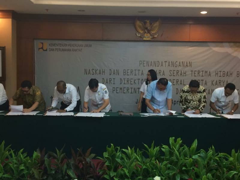 “Dalam rangka tertib administrasi sesuai Peraturan Pemerintah Nomor 27 Tahun 2014 dan menindaklanjuti persetujuan hibah yang telah diterbitkan Kementerian Keuangan serta Kementerian Pekerjaan Umum dan Perumahan Rakyat, saya dan beberapa kepala daerah di Indonesia melakukan penanda-tanganan naskah dan Berita Acara Serah Terima Hibah Barang Milik Negara di Jakarta,” ujar Walikota GSVL yang turut didampingi Kadis PUPR Kota Manado DR Bart Assa.