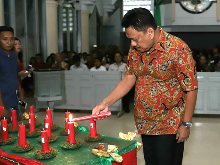 Pemasangan lilin oleh Gubernur Sulut Olly Dondokambey pada ibadah menyambut Natal di GMIM Sion Malalayang