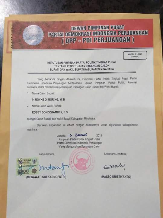 Demikian SK DPP PDIP untuk Pilkada Minahasa