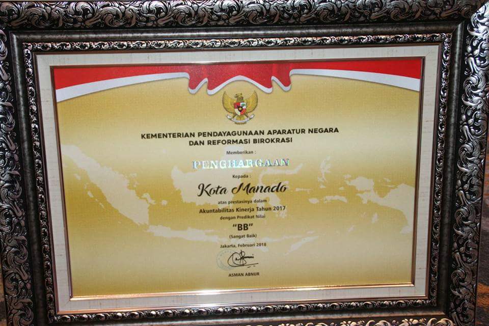 manadomanadoterkinu.com, MANADO – KOTA Manado menjadi satu-satunya kota/kabupaten di Sulawesi Utara yang mendapat nilai BB dalam Sistem Akuntabilitas Kinerja Instansi Pemerintah (SAKIP) tahun 2018.