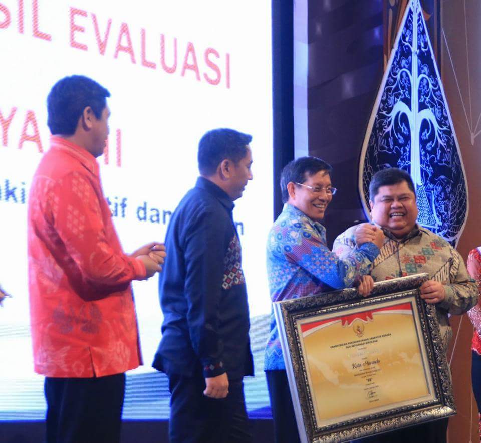 Penyerahan piagam penilaian tersebut diserahkan Menteri Pendayagunaan Aparatur Negara dan Reformasi Birokrasi (MenPAN-RB) DR Asman Abnur SE MSi kepada Walikota Manado DR Ir GS Vicky Lumentut SH MSi DEA di Ball Room Hotel Tentrem Jogjakarta, Selasa (13/02) siang tadi.manado