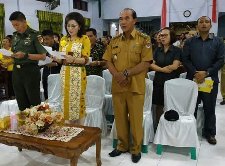 Usai memberikan sambutan, Tetty sapaan akrab Bupati Minsel ink mendoakan jemaat dan berbagi kasih kepada semua yang hadir.