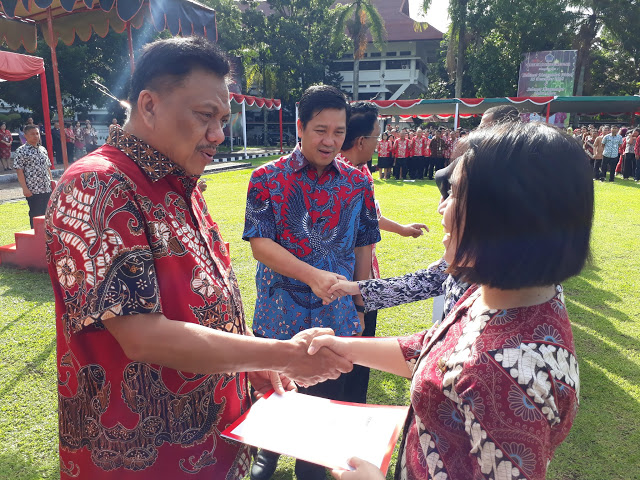 manadoterkini.com, SULUT – Gubernur Sulut Olly Dondokambey didampingi Wagub Steven Kandouw dan Sekda Edwin Silangen menyerahkan SK PNS/SK 100 persen kepada 10 guru garis depan tingkat SMA/SMK pada Apel Kerja pasca libur Natal dan Cuti bersama, di halaman Kantor Gubernur, Kamis (03/01/2019).