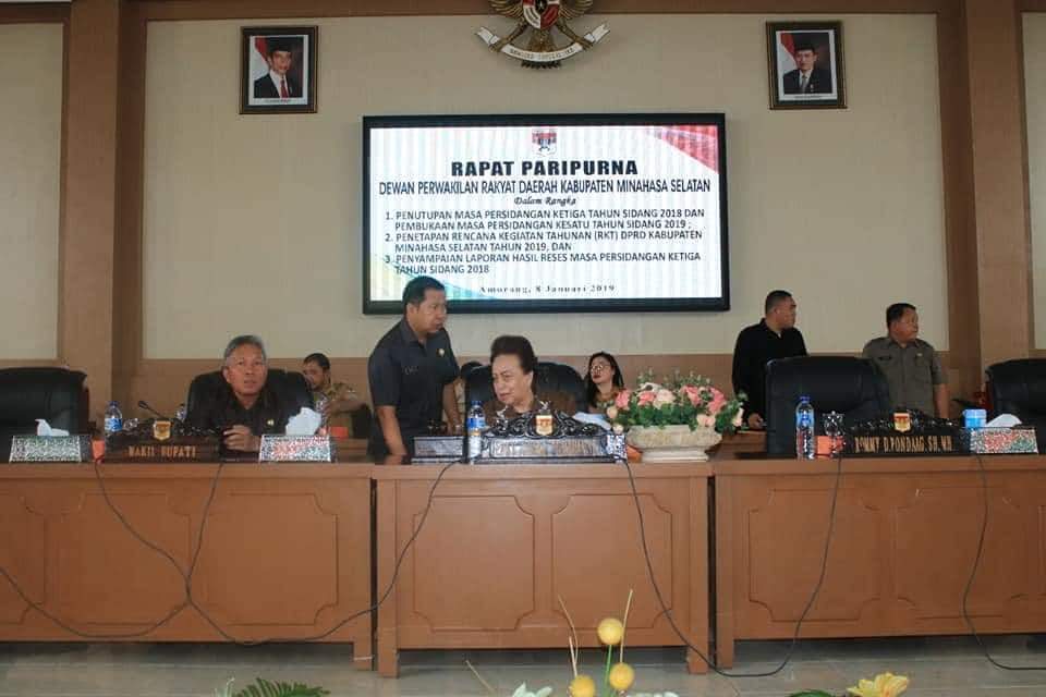 manadoterkini.com, AMURANG – Dewan Perwakilan Rakyat Daerah (DPRD) Kabupaten Minahasa Selatan (Minsel), menggelar Rapat Paripurna Tutup Buka Masa Sidang Tahun 2019, Penetapan Rencana Kerja Tahunan (RKT) untuk tahun sidang 2019, Penetapan Program Pembentukan Daerah Tahun 2019, Selasa (8/1/2019) siang.