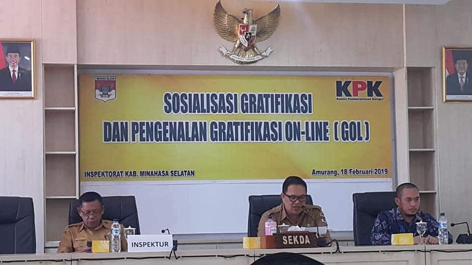 minselmanadoterkini.com, AMURANG-Untuk menekan terjadinya gratifikasi, Komisi Pemberantasan Korupsi (KPK) menggelar sosialisasi pelaporan dan pengendalian gratifikasi di Pemkab Minahasa Selatan (Minsel), Senin (18/02/2019).