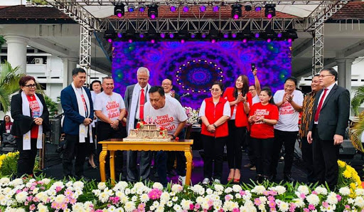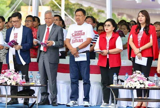Gubernur Sulawesi Utara Olly Dondokambey nampak bersukacita. Olly yang tampil mengenakan kaus putih bertuliskan “Torang Samua Ciptaan Tuhan” ini ikut bernyanyi dan bertepuk tangan bersama seluruh jemaat.