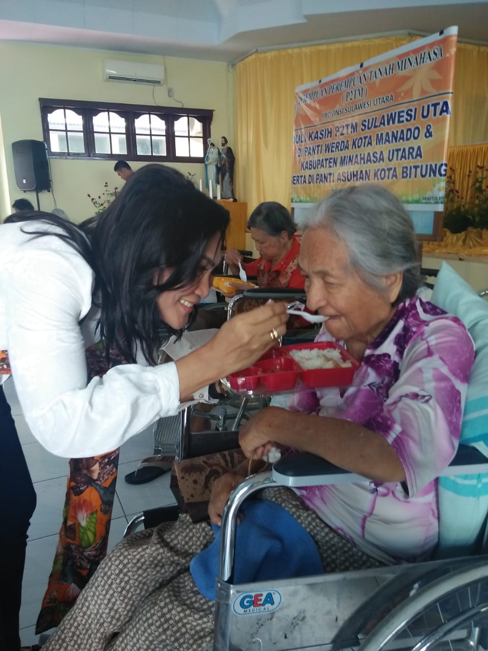 Bersama Rombongan Perempuan Perempuan Tanah Minahasa (P2TM), Rawung terlihat antusias dalam menyapa bahkan tak segan isteri Wali Kota Bitung tersebut terlihat menyuapi para lansia di Rumah Panti Werda.