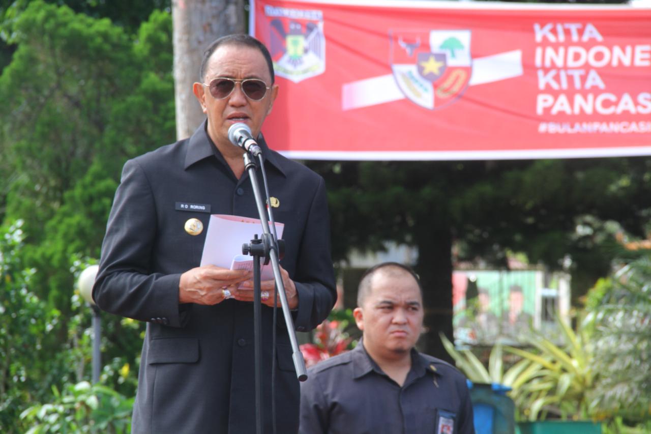 minahasamanadoterkini.com, TONDANO – Bupati Minahasa Ir Royke Oktavian Roring MSi bertindak sebagai Inspektur Upacara (Irup) dalam peringatan Hari Lahir Pancasila ke-74 yang dilangsungkan di Halaman Kantor Bupati Minahasa.