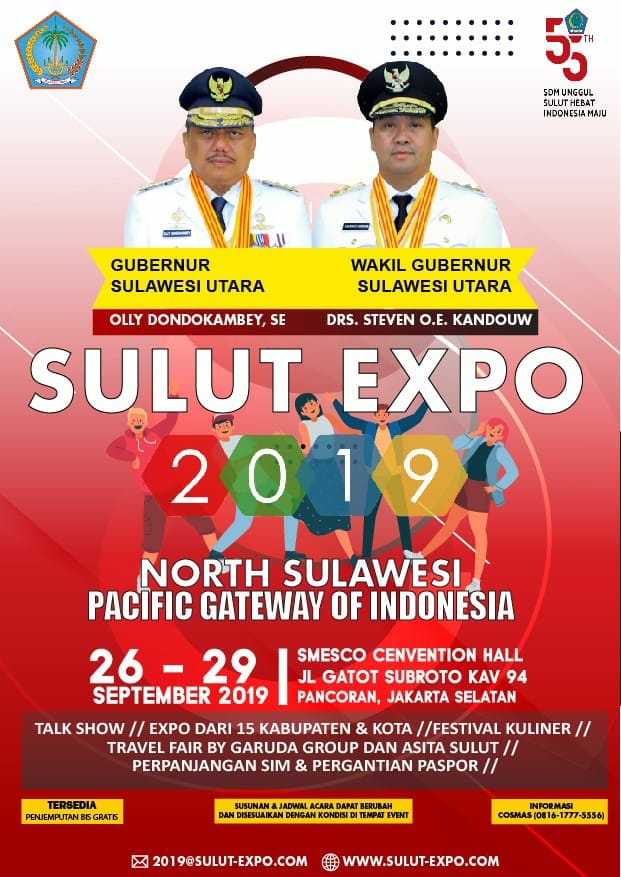 Sulut Expo 2019 yang merupakan rangkaian dari kegiatan HUT ke-55 Provinsi Sulut yang puncaknya dirayakan dengan pesta rakyat pada tanggal 23 September 2019 di Lapangan Sario Manado, akan dibuka pada Kamis (26/9/2019) oleh Gubernur Sulut Olly Dondokambey.