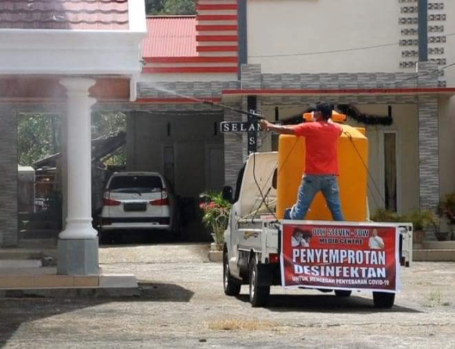 Dalam melakukan penyemprotan cairan desinfektan tersebut terdapat satu kendaraan roda empat yang digunakan relawan dalam penyemprotan.