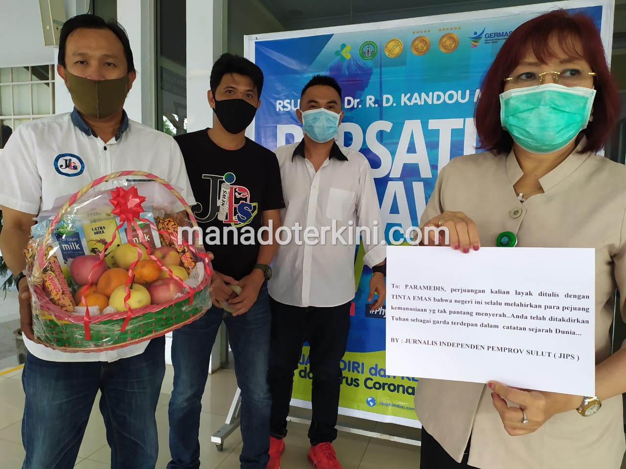 Sulutmanadoterkini.com, Sulut – Aksi sosial kembali dilaksanakan oleh Jurnalis Independen Pemprov Sulut (JIPS), dengan memberikan semangat kepada pasien positif COVID-19 dan para medis di Rumah Sakit di Manado, Senin (20/04/2020).
