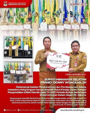Bupati Minahasa Selatan Franky Donny Wongkar SH, menyebutkan Penghargaan Insentif Fiskal diberikan Kementerian Keuangan, karena Pemkab Minsel dinilai mampu menekan Inflasi Daerah pasca pandemi covid-19.