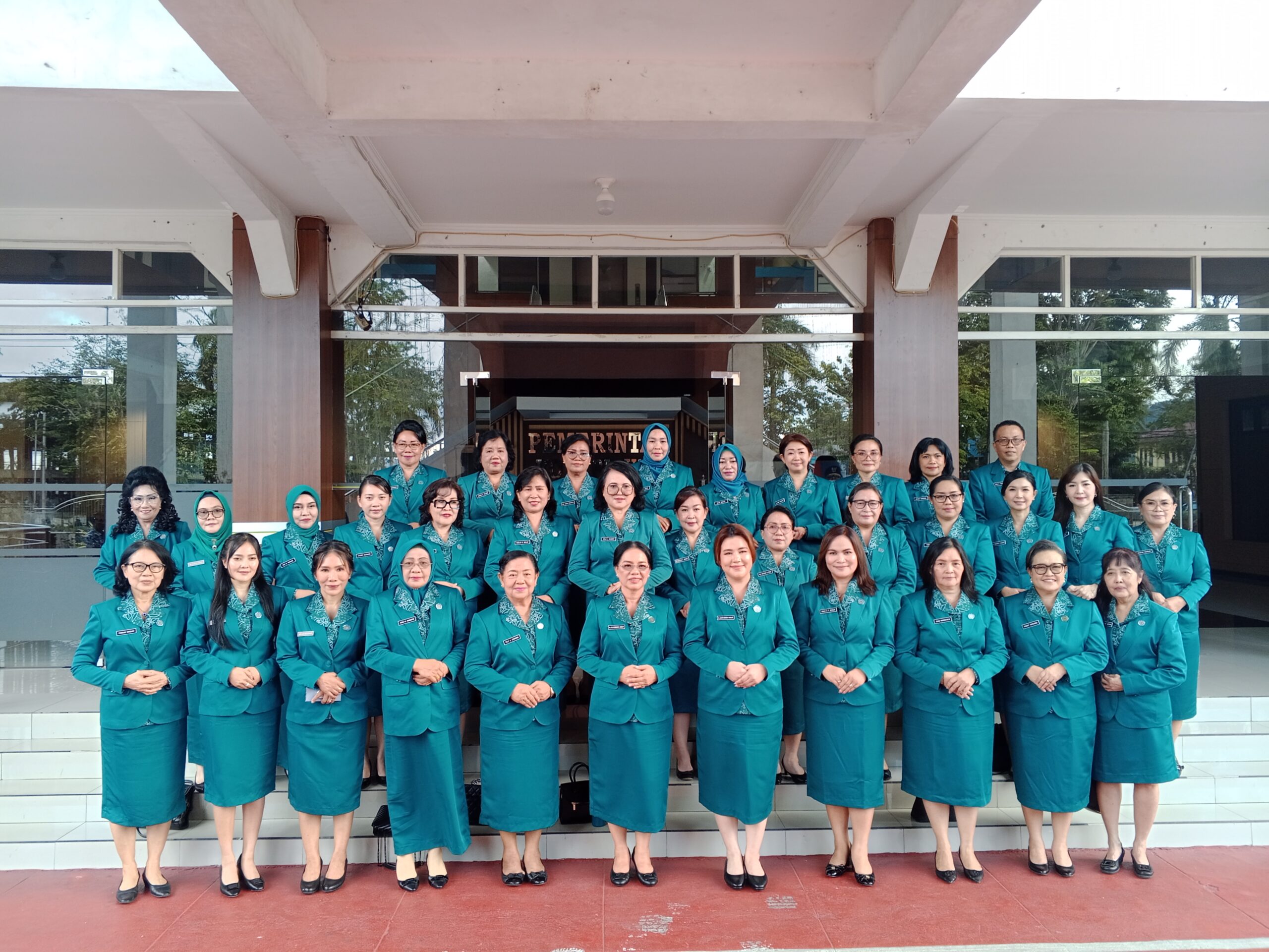 Foto bersama jajaran Pengurus TP-PKK Kota Bitung dengan Wali Kota Hengky Honandar dan Wawali.