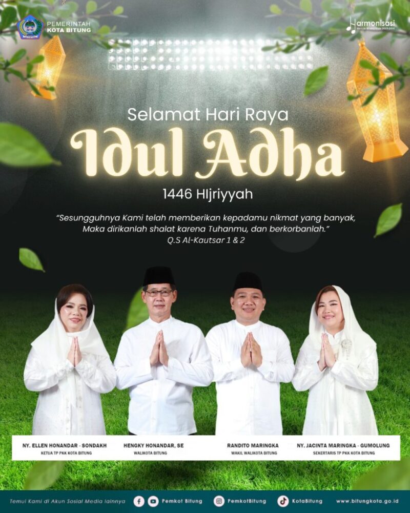 Wali Kota Bitung Hengky Honandar dan Wakil Wali Kota Randito Maringka, bersama Keluarga, dan Pemerintah Kota Bitung mengucapkan Selamat Hari Raya Idul Adha 10 Dzulhijjah 1446 Hijriyah kepada seluruh masyarakat Kota Bitung.
