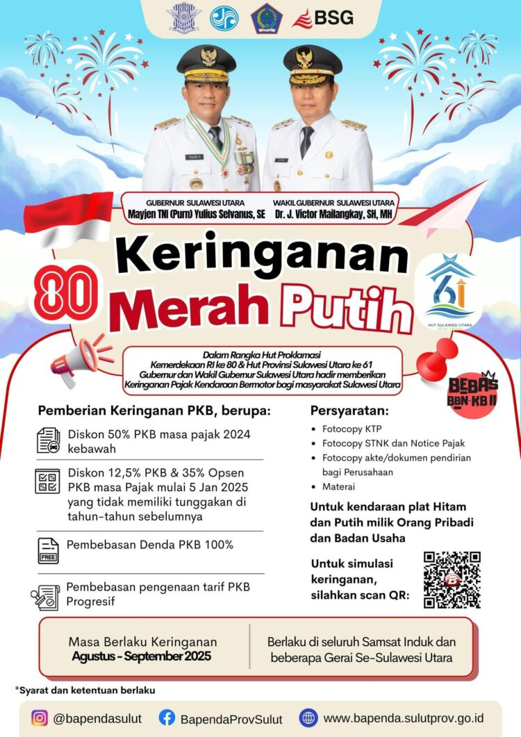 Peluncuran Program Keringanan Pajak Merah Putih menjadi sorotan utama kegiatan tersebut. Program ini disebut sebagai “kado spesial” Pemprov Sulut untuk rakyat, dengan rincian: