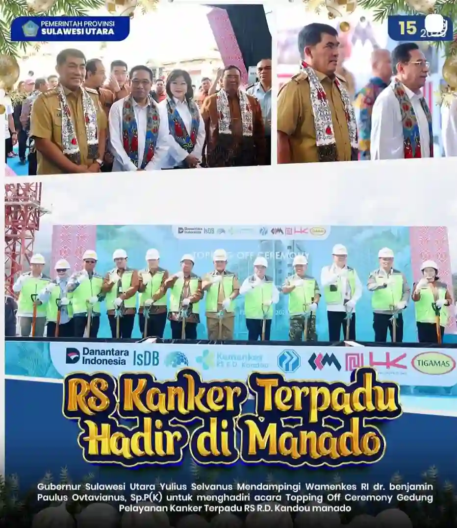 manadoterkini.com, SULUT – Posisi geografis Sulawesi Utara yang strategis di kawasan timur menjadikannya simpul penting layanan kesehatan regional. Demikian penegasan Gubernur Mayjen TNI (Purn) Yulius Selvanus SE, dalam Topping Off Ceremony pembangunan Gedung Pelayanan Kanker Terpadu Rumah Sakit Umum Pusat (RSUP) Prof. Dr. R. D. Kandou Manado, Senin (15/12/2025).
